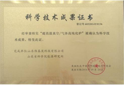 2014年8月25日,由我公司自主研發(fā)的“超高溫真空/氣體高純化爐”通過了中國高科技產(chǎn)業(yè)化研究會(huì)的科學(xué)技術(shù)成果鑒定,鑒定意見為國內(nèi)首創(chuàng),技術(shù)處于國際先進(jìn)水平。